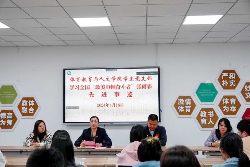 为充分发挥先进典型示范引领作用,扎实推进党支部思想道德和作风建设专项教育工作有效开展,4月18日下午,体育教育与人文学院学生党支部在教学办公楼220会议室开展全国“最美巾帼奋斗者”张雨霏先进事迹学习宣传会。体育教育与人文学院学生党支部书记喻菊主持会议,学生党支部全体成员参加会议。
