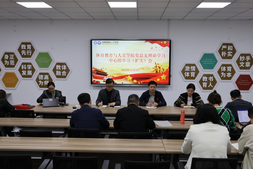 11月3日,体育教育与人文学院召开党总支理论学习中心组2025年第11次学习(扩大)会。学院党总支理论学习中心组成员、各系部副主任、各支部委员、全体行政人员参加会议。会议由党总支书记卢奎主持。