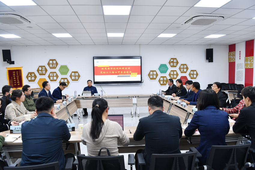 11月26日,党委书记刘红明为体育教育系党支部党员教师宣讲党的二十届四中全会精神。体育教育系党支部书记霍军主持会议。体育教育与人文学院党总支书记卢奎列席会议。