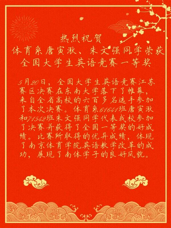 体育系唐寅秋、朱文强同学荣获全国大学生英语竞赛一等奖