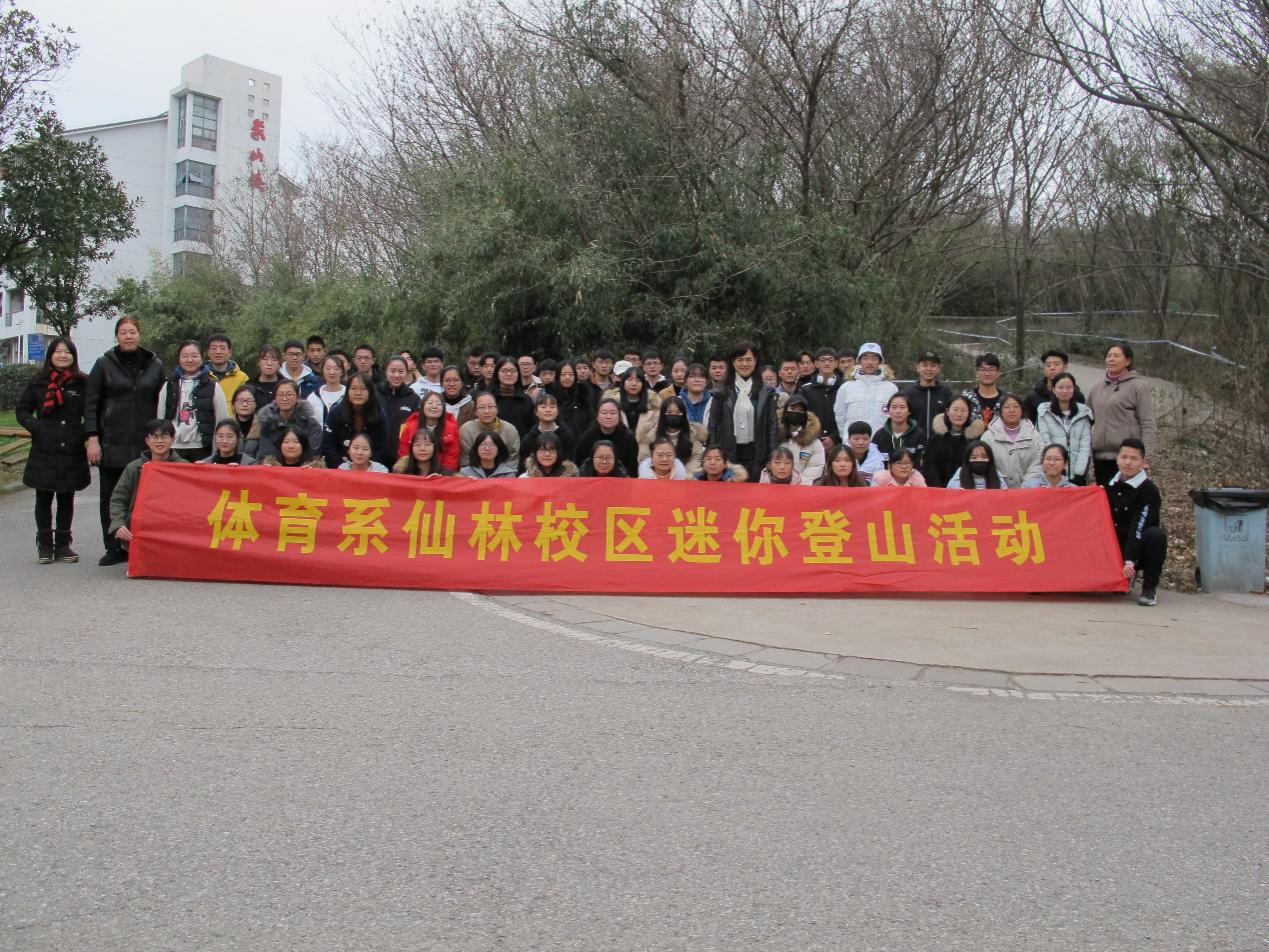 2018年12月19日,南京体育学院体育系第四届仙林校区迷你登山活动如期举行。体育系党总支书记、主任沈鹤军,体育系党总支副书记、副主任陈荣梅,体育系教务员庄萍华,体育系辅导员张伊卓和2018级体育经济与管理专业的全体学生参与了此次活动。